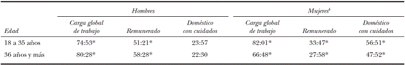 Por otra parte, se evidencia cómo, en el caso de los hombres de 18 a 35 años, éstos dedican más tiempo al trabajo no remunerado que los de 36 años y más, y que las mujeres de este grupo de edad reportan más tiempo en trabajo remunerado que las del grupo de 36 años y más de los hombres. Al respecto Garrido (2000: 13) plantea que "en general, e independientemente del hecho de que la participación de los varones sea mayor en los hogares en los que la mujer tiene un empleo remunerado aun en estos casos, la mayor parte del trabajo doméstico sigue siendo realizado por las mujeres".