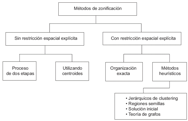 Dada la dificultad de resolver esta problemática de manera exacta se ha incrementado el uso y desarrollo de heurísticas.7 El grupo jerárquicos de clustering adaptados solamente permite regiones que se conecten espacialmente y cada área es una región en la fase inicial. Una referencia tradicional es la de Lankford (1969), donde se realizan comparaciones contra otros métodos. El autor concluye que el método de centroides requiere de numerosas repeticiones para alcanzar un patrón definido, mientras que el algoritmo de Ward brinda resultados similares al de centroides, resaltando la sensibilidad del resultado ante el algoritmo elegido. La propuesta del autor es la que mejor identifica los patrones, además de examinar solamente a los vecinos inmediatos cuando se agregan más puntos al patrón.