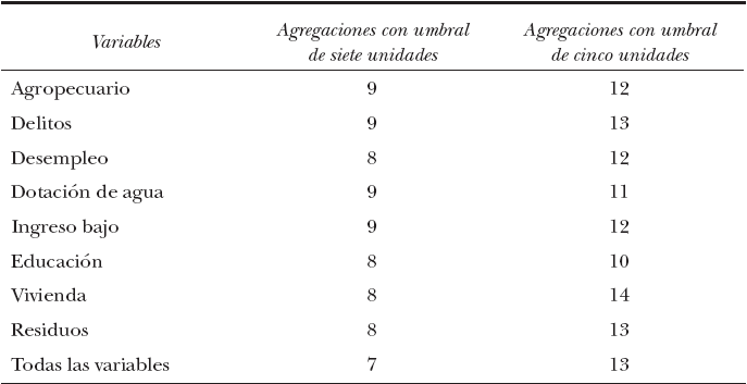 Se puede inferir que el incremento en el número de agregaciones cuando se reduce el número de municipios por región se debe a dos cuestiones. En primer lugar, a la heterogeneidad existente entre las unidades y, por otro lado, a que el algoritmo busca el mayor número de agregaciones posibles. En este punto, sin embargo, hay que evitar la confusión. Si las unidades presentaran mayor homogeneidad, el número de agregaciones debiera ser menor a pesar de que el umbral se redujera. No obstante, no son lo suficientemente similares y por ello el algoritmo genera más agregaciones a fin de cumplir con la función objetivo: determinar el mayor número de agregaciones con el menor valor de heterogeneidad total en su interior.