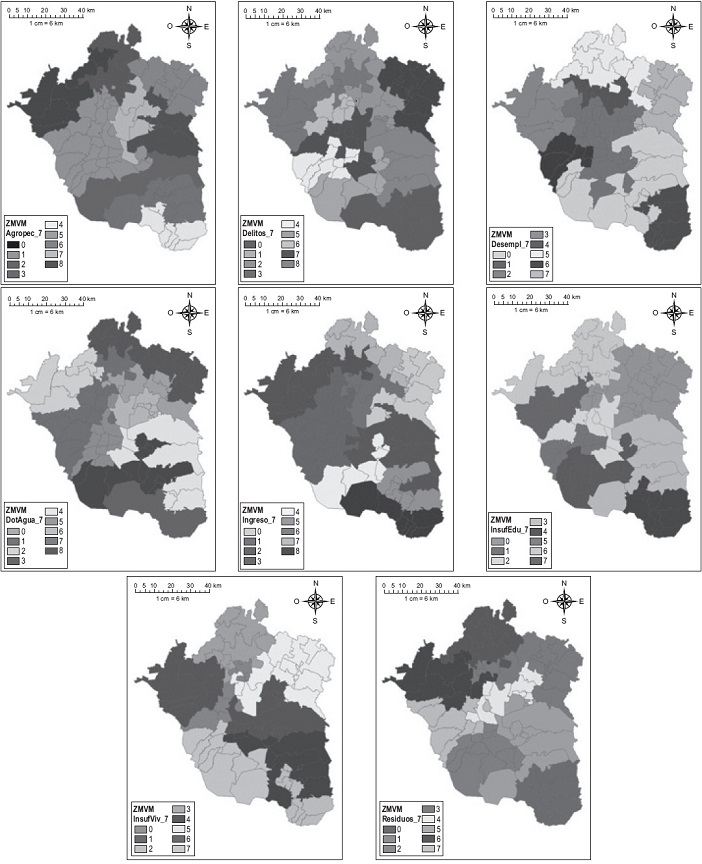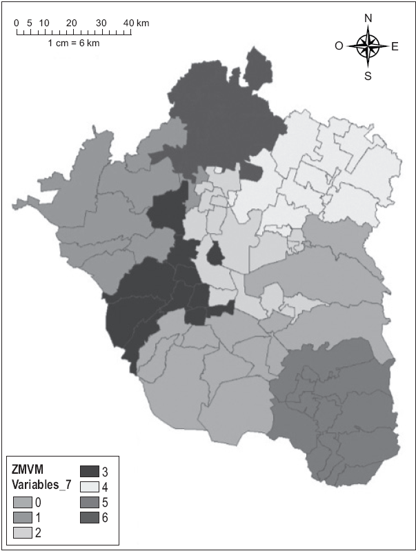 En los Mapas 1 y 2 hay un elemento a destacar.15 A pesar de existir diferentes patrones de acuerdo con cada una de las variables, se presenta cierta similitud entre sí y respecto de la agregación del Mapa 2. Esto supone que hay una diferenciación entre los municipios que resalta a pesar de considerar diferentes variables, lo que hace pensar en el MAUP. Es decir, en el ámbito nacional la ZMVM surge como una región con características propias que puede diferenciarse, pero en su interior siguen presentándose contrastes. Dichos contrastes seguramente persisten a una escala menor, como localidades o ageb; sin embargo existe una cuestión de suma importancia: si bien a menor escala se obtienen resultados más precisos, en términos de política pública debe usarse la escala que mejor permita la colaboración de los distintos ámbitos de gobierno.