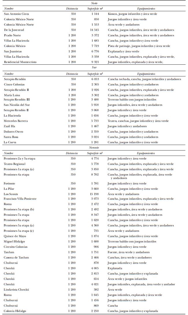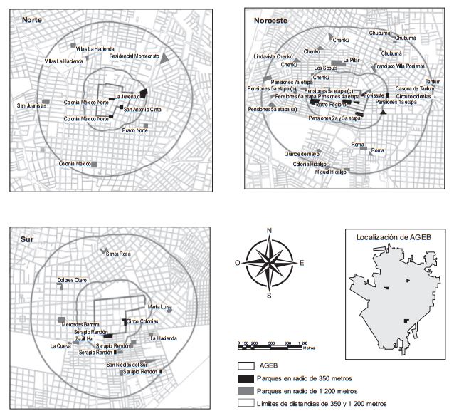 En el norte, los que se localizan a una distancia corta de las viviendas encuestadas son cuatro: tres son muy pequeños (menores de 1 553 metros cuadrados) y uno con una dimensión considerable (el De la Juventud tiene 14 545 metros cuadrados). Los elementos que tienen los cuatro parques son: cancha de usos múltiples, juegos infantiles, áreas vedes y andadores. A una distancia media a la AGEB analizada se encuentran parques más grandes, pero con similares elementos a aquellos más cercanos. Véase el cuadro 1 y el mapa 1 para las descripciones y ubicaciones de los parques de Mérida mencionados.