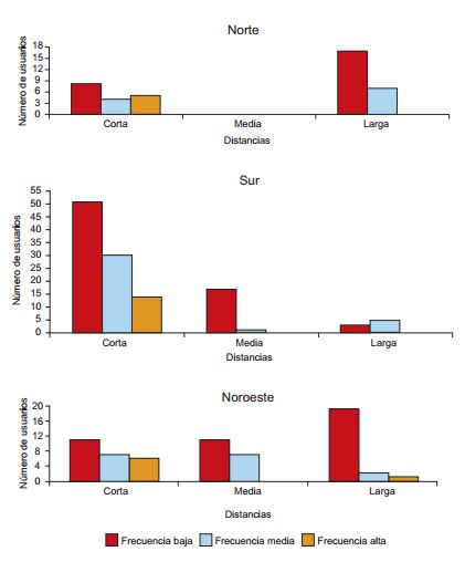 En cuanto a las frecuencias de visitas, asociadas a las distancias que se recorren de la vivienda a los parques, el patrón de uso que se esperaría es una periodicidad de uso alta (8 veces y más al mes) relacionada con un recorrido corto (hasta 350 metros); una frecuencia de uso media, asociada con una distancia media; y que a una baja periodicidad (menos de una vez por semana) le corresponda un trayecto largo (mayores a los 1 200 metros). La realidad muestra otro patrón: prevalecen los trayectos cortos para las frecuencias alta, media y baja (gráfica 1). Por otro lado, los trayectos largos realizados con baja frecuencia son llevados a cabo por un número importante de población de las zonas norte y noroeste. Asimismo, en la zona norte es significativo el número de usuarios de los parques que se desplaza a otras zonas de la ciudad (distancias largas) con una asiduidad media.