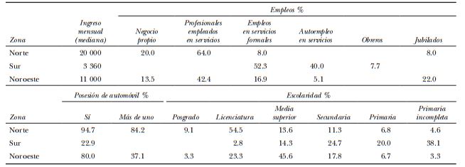 En la zona norte reside la población con los más altos índices de escolaridad y de ingreso; en cuanto a su ocupación, prevalecen los profesionales empleados en servicios. Todas las familias cuentan con automóvil y la gran mayoría tiene dos o más (cuadro 2). En el extremo opuesto se encuentra la zona sur, donde reside la población con más bajos salarios e índices de escolaridad. Una gran proporción de los colonos del sur trabaja por cuenta propia, como electricistas, carpinteros y pintores de casas, y un pequeño porcentaje de los vecinos cuenta con automóvil. La población del noroeste tiene cualidades que la ubican en una situación intermedia entre los del norte y los del sur, tanto en relación con sus ingresos como con sus niveles de escolaridad; en esta zona están representadas las capas medias de la población de Mérida. La ocupación es la de profesionales empleados en servicios.