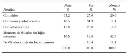 El más antiguo de los tres asentamientos es el noroeste; en éste se encuentra el mayor número de familias con hijos adultos, así como también la mayor proporción de jubilados y de adultos mayores. En segundo lugar se encuentra la zona sur, donde en la mayoría de las familias hay niños y adolescentes. El asentamiento más reciente es el del norte, donde predominan las familias con niños y son pocos los adultos mayores (cuadro 3).