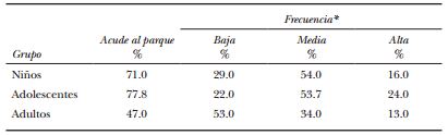 Los resultados de la encuesta muestran que los adolescentes representan el grupo que más visita los parques recreativos y con más asiduidad (cuadro 4). En el otro extremo, tenemos que los adultos son el grupo de edad que menos asiste y con menos frecuencia. Dentro de cada zona las frecuencias por grupos de edades difieren entre sí.