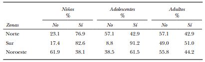 Por el contrario, los pobladores de la AGEB del sur reportan el mayor porcentaje de asistencia en los tres grupos de edad, y entre éstos, los niños y adolescentes con amplia ventaja (82.6 y 91.2%, respectivamente). La asistencia de los adolescentes de esta zona a los parques recreativos es, con mucho, mayor que la de los otros grupos y que en las otras zonas, tanto por el número de jóvenes que asiste, como por su asiduidad media y alta. Los adultos representan el grupo que menos visita dichos lugares de recreación, y la mayoría de ellos acude con una periodicidad baja.