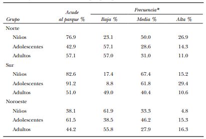 Los cuadros 5 y 6, de presencia-ausencia y de afluencia y frecuencia de uso de los parques, muestran que en la zona norte, a diferencia de lo que prevalece a nivel general, los adolescentes son el grupo que menos acude a los parques, y entre los jóvenes que sí los visitan, más de la mitad lo hace con baja frecuencia. El grupo de niños de esta zona es el que sobresale por su asistencia, sin embargo la mayoría de los infantes acude a los parques con frecuencia media.