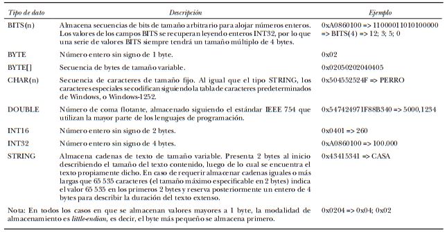 En el cuadro 1 se especifican estos tipos de datos, los cuales se utilizan en las descripciones posteriores para indicar las formas de almacenamiento de cada valor.