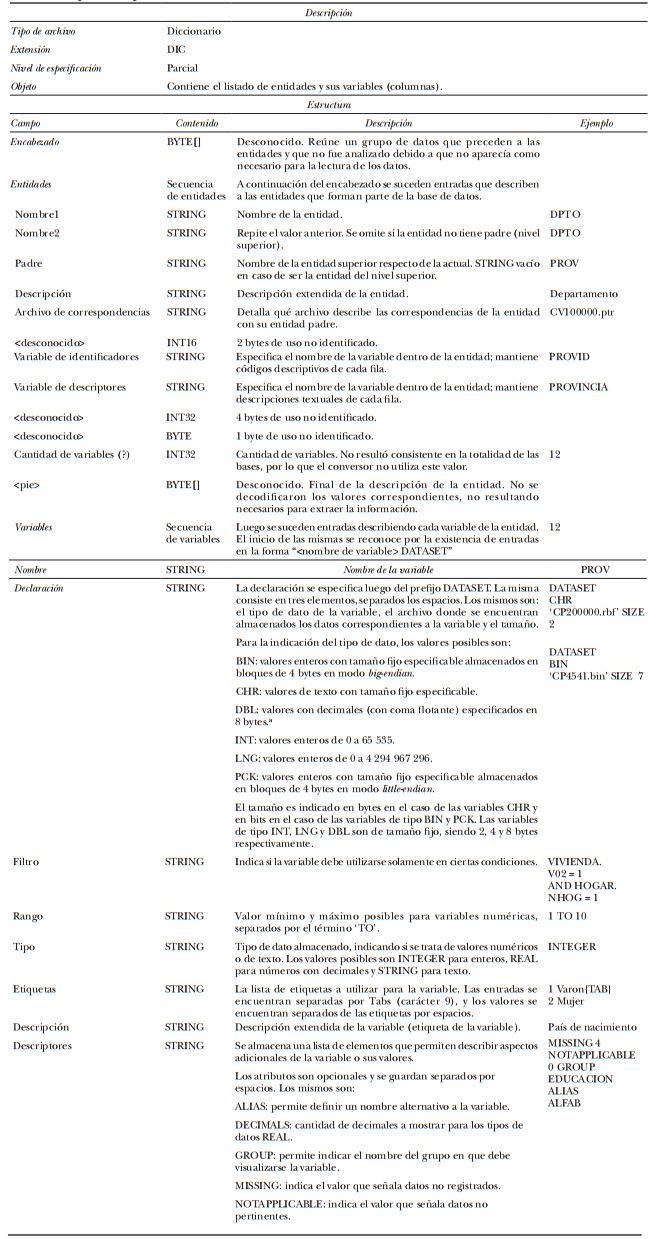 La estructura del archivo cuenta con un encabezado que posee atributos generales de la base de datos, el cual no ha sido descrito en esta etapa de la investigación por no ser vinculante para la descripción de los datos. A continuación del encabezado se encuentra una lista de bloques que describen a cada uno de los tipos de entidades contenidos en la base de datos (por ejemplo, provincias, departamentos, hogares, personas).
