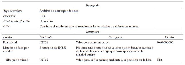 La observación arrojó también como resultado que los archivos .PTR (que hemos llamado aquí “de correspondencias”) funcionan como índices o tablas de referencias para determinar a qué entidad de un nivel superior corresponde una entidad de un nivel inferior. Existe un archivo de correspondencia por cada tipo de entidad contenida en la base de datos. Los mismos permiten resolver, por ejemplo, a la hora de calcular un resultado, en qué provincia se encuentra cierto departamento, o en qué hogar se encuentra cierta persona.