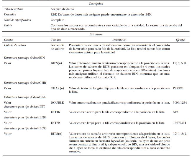 Los archivos de datos del paquete analizado, indicados en el diccionario para cada variable, contienen la información de los valores que cada variable posee en cada entidad. Esto implica que existe un archivo de datos para cada variable (por ejemplo, Persona. Edad, Persona. Sexo, Persona.Ocupación). Por esta razón no hay un archivo único de datos para cada tipo de entidad (como Personas), por lo que la consulta de una lista de entidades requiere la lectura de varios archivos en forma simultánea.
