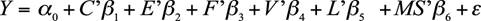 [1]donde α 0 es el término constante; C’, E’, S’, F’, L’ y MS’ representan vectores de variables clasificadas de acuerdo con el cuadro 2. El vector C’ contiene las variables relacionadas con las características personales; E’ incluye las de aspectos económicos de la vivienda; F’ incorpora las que se refieren al medio ambiente físico; V’ las características de la vivienda; L’ añade la variable de localización y proximidad y, por último, MS’ contiene aquellas correspondientes al medio ambiente social. Asimismo, los vectores β1, β2 … β6 contienen los parámetros de las variables independientes en los vectores correspondientes y ε es el término del error.
