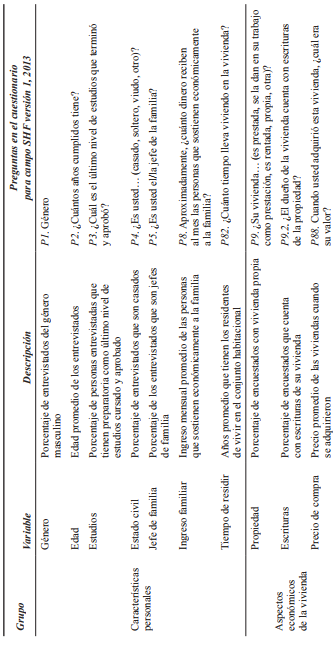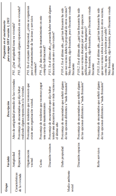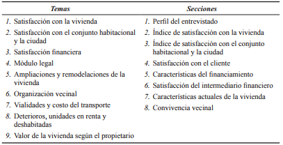 La encuesta considera nueve temas distribuidos en ocho secciones (cuadro 1). Contiene preguntas abiertas, de opción múltiple, y otras en las que se le pide al entrevistado que determine una calificación o grado de afirmación sobre una serie de atributos relacionados con la morada, el conjunto y el módulo legal en el que la adquirió.