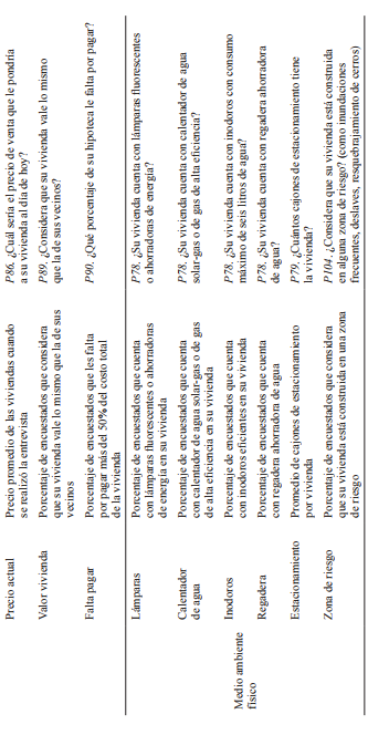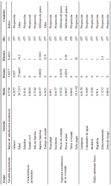 Para el grupo de características personales, se tomaron el género, la edad, el último nivel de estudios alcanzado por el encuestado, el estado civil, si es jefe de familia, el ingreso mensual promedio de quienes habitan la vivienda y el tiempo de residir en ella. En el grupo de aspectos económicos se incluyeron las variables de propiedad -que indica si el encuestado posee la morada o si es rentada, prestada, o cualquier otra modalidad-, si cuenta con escrituras, el precio de compra, el precio actual, la percepción del encuestado sobre el valor de su vivienda en relación con el valor de la de sus vecinos y el porcentaje que le falta por pagar del inmueble. El tercer grupo es el del medio ambiente físico; aquí se incorporaron cuatro variables relacionadas con el equipamiento ecológico en los hogares, como la disponibilidad de lámparas fluorescentes, calentador de agua solar, inodoros eficientes y regadera ahorradora de agua. Asimismo, se añadió el número de cajones de estacionamiento por vivienda en el conjunto habitacional y la percepción del encuestado sobre la colonia como zona de riesgo.