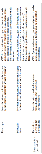 Con base en la ESR 2013, en este estudio utilizamos los seis grupos de variables de determinantes de la satisfacción con la colonia de Lovejoy et al. (2010), relacionados a las características de la vivienda y del conjunto habitacional, para agrupar las variables independientes. El cuadro 2 muestra las variables de la ESR que se incluyeron en el modelo de satisfacción con el conjunto habitacional y la pregunta que le corresponde en la ESR.
