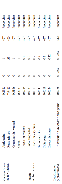 Respecto al apartado de características del inmueble, se tomó en cuenta la antigüedad de la construcción y las reparaciones que se le han hecho. El grupo de localización y proximidad incluyó sólo una variable de la ESR 2013, la cual indica la percepción del encuestado en cuanto al número de viviendas abandonadas en su conjunto habitacional. El sexto grupo de variables, denominado medio ambiente social, se compone de ocho variables que incluyen la existencia de alguna forma de organización vecinal, si se cobran cuotas de mantenimiento, y otras que tienen como objeto capturar el estado de las relaciones entre los vecinos. En este sentido se incorporan indicadores sobre conflictos entre los vecinos por daños a la propiedad, por el uso de espacios comunes, por haber sufrido robos, porque no se pagaron los servicios comunes o por el mal uso de áreas de esparcimiento dentro del conjunto habitacional. El cuadro 3 contiene la estadística descriptiva de todas las variables empleadas en este estudio.