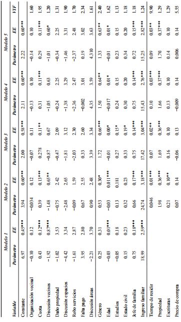 El cuadro 4 contiene los resultados de las estimaciones. La última columna presenta el VIF de cada variable independiente. Como se observa, sólo la variable que denota el tiempo promedio de años que los entrevistados tienen de vivir en el conjunto habitacional (tiempo de residir) arrojó un VIF de casi 10. Al eliminar esta variable de la estimación los resultados prácticamente no presentaron ninguna variación, es por eso que optamos por incluirla en los modelos. Las otras variables independientes no parecen presentar problemas serios de multicolinealidad.