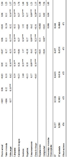 Hacemos notar que a diferencia de los resultados de Lu (1999) y Mohan y Twigg (2007), ninguna de las variables asociadas con el precio o el valor de la vivienda (precio de compra) y el precio de venta promedio en el momento de la entrevista (precio actual), ayudaron a explicar las diferencias en la satisfacción residencial promedio entre los complejos habitacionales. Tampoco la comparación del valor de la casa con la de los vecinos (valor vivienda) resultó afectar positivamente la satisfacción residencial, como demostraron Lovejoy, Handy y Mokhtarian (2010).