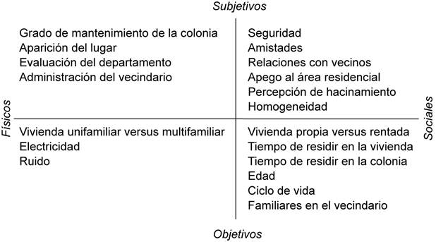 Existen por lo menos cinco teorías que modelan el concepto de satisfacción residencial: la teoría de las necesidades de vivienda (Rossi, 1955), la teoría de la satisfacción residencial (Michelson, 1977), la teoría del déficit de vivienda (Morris y Winter, 1978), la teoría de la construcción psicológica (Galster, 1985) y la teoría del hombre y su ambiente (Amérigo y Aragonés, 1997). Esta última establece que la interacción entre un individuo con el ambiente es a través de atributos objetivos y subjetivos. Los primeros se refieren a la calidad de la vivienda y los servicios que contribuyen a la satisfacción residencial. Éstos se convierten en subjetivos una vez que han sido evaluados por la persona que emite su grado de satisfacción. Por lo tanto, los subjetivos están influidos por las características personales, tales como el ingreso, la edad, el nivel de estudios, etc. (esquema 1). La teoría del hombre y su ambiente es la que sigue principalmente nuestra investigación. Siguiendo este enfoque, Amérigo y Aragonés (1997) estudian los determinantes de la satisfacción residencial. Los clasifican en sociales y físicos, dependiendo si el atributo forma parte del ambiente físico o social; y en categorías objetivas o subjetivas, que dependen de que el atributo sea objetivo o forme parte de una evaluación del residente (esquema 2).