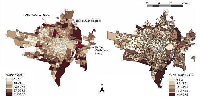 Dentro de las áreas de mayor pobreza en la ciudad, definidas por la última categoría cartográfica de intensidad del IPMH, se seleccionaron tres barrios (Villa Muñecas Norte, Juan Pablo II y Costanera Norte) para realizar las entrevistas abiertas a los jóvenes (véase el mapa 2). Tales barrios tienen en común la persistencia de la pobreza durante al menos medio siglo. En 2010, según el método de las NBI, tenían 30% de hogares con alguna condición de pobreza, lo que implica una disminución del 5% respecto de 2001.