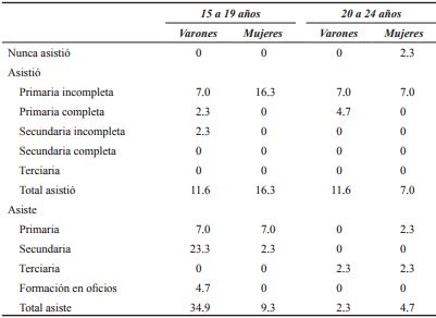 Los que permanecen en el sistema educativo se localizan principalmente en la franja etaria de 15 a 19 años. En su mayoría cursan el nivel secundario, presentando una mayor inserción educativa que el grupo de jóvenes que ya no asiste. Se incluye en este grupo a los jóvenes que se encuentran en formación en algún oficio, aunque dicha modalidad se inscriba en el campo de la educación no formal (véase el cuadro 1). Cabe destacar que hay una mayor inserción educativa de los varones. Entre los jóvenes entrevistados que no asisten, el abandono escolar temprano tiene una magnitud sustantiva en tanto que el 40% no terminó el nivel primario.
