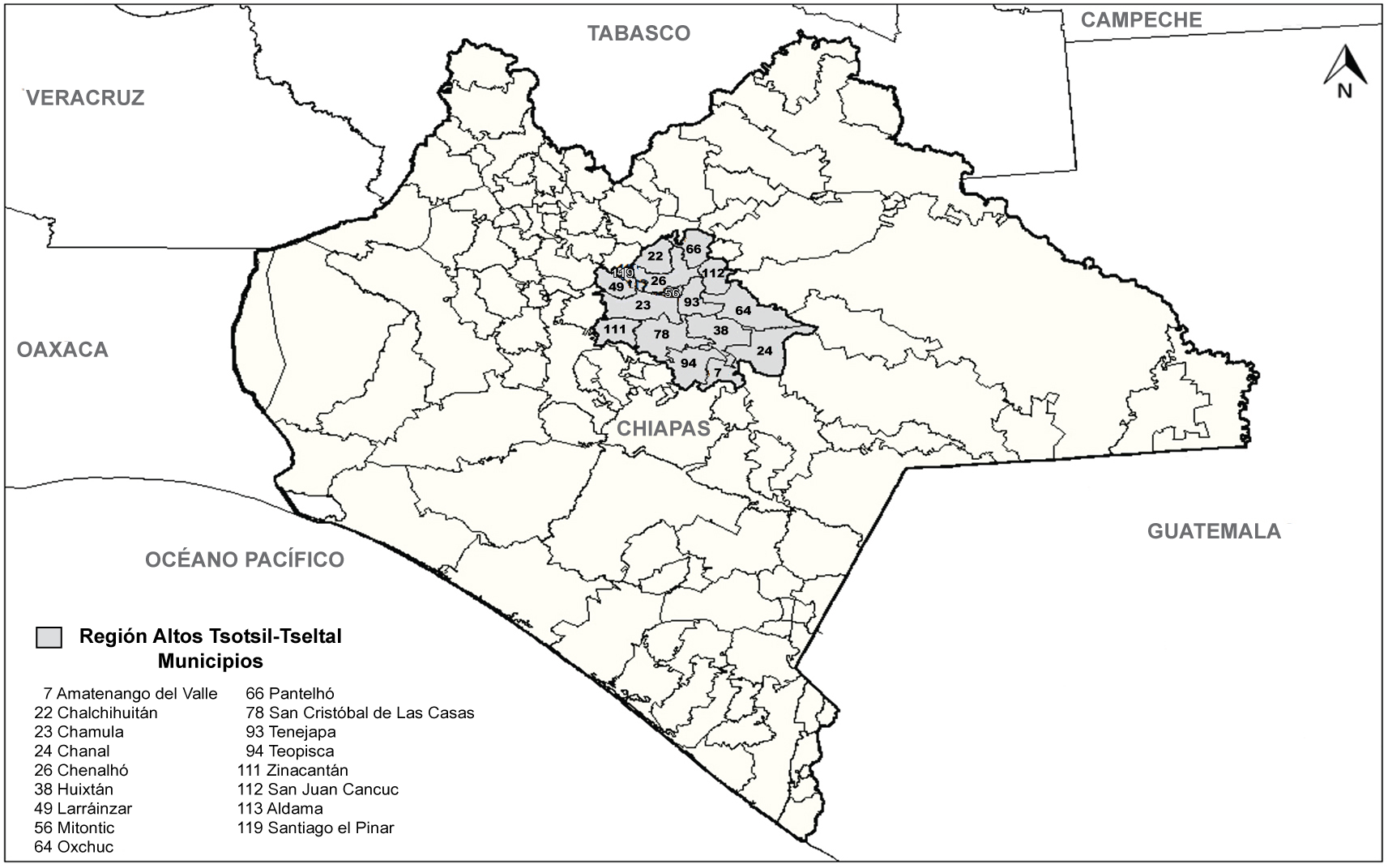 Esta área geográfica (constituida por 17 municipios, Mapa 1) fue elegida debido a que en la mayoría de sus municipios (15) prácticamente toda la población es hablante de alguna lengua indígena (98%) y 54% no habla español -es decir, es monolingüe- (INEGI, 2010). La ciudad más importante de esta región y punto de confluencia de estos municipios es San Cristóbal de Las Casas, en la que 36.7% de la población es indígena y 7% monolingüe.