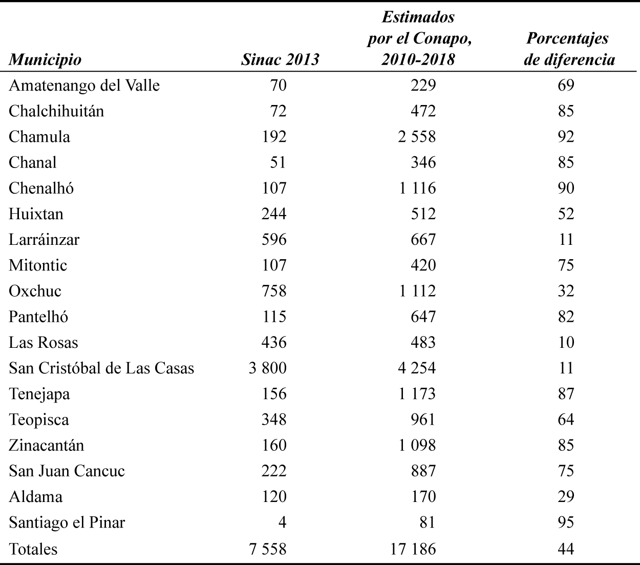 Para 2013 se estimaron por Conapo 17 186 nacimientos en Los Altos, y a través de Sinac 7 558, es decir, existió una diferencia de 44%; las diferencias en cada municipio fueron de 10% en la ciudad de San Cristóbal de Las Casas, y hasta 95% para el caso de Santiago El Pinar (Cuadro 1).