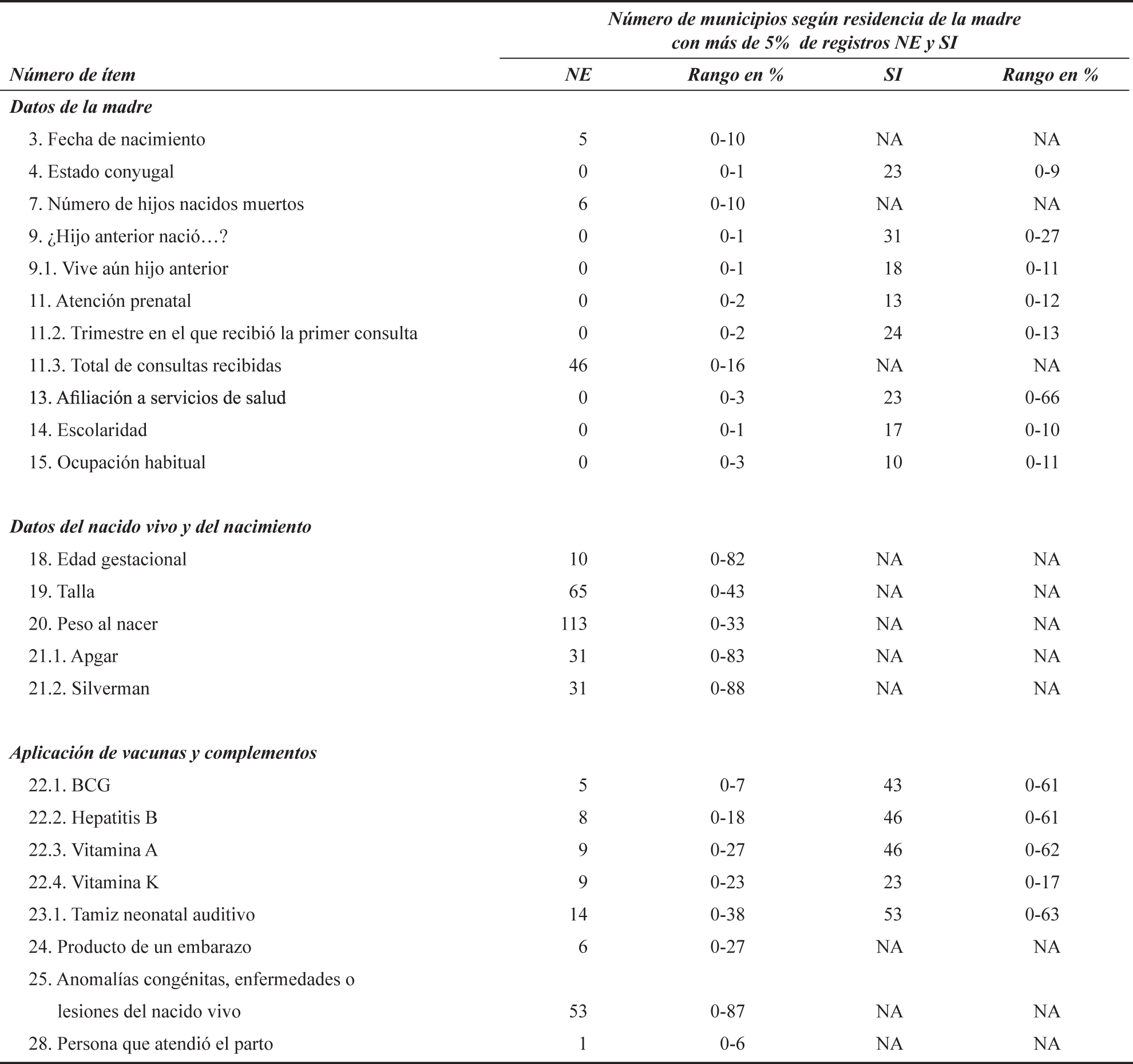 Por un lado, en 14 de las 32 variables incluidas en el CN hubo NE de más de 5%, encontrándose irregularidades con NE y SI en 113 municipios. Para la información con NE el menor rango fue para las variables de persona que atendió el parto (0-6%) y vacuna BCG (0-7%) en uno y cinco municipios respectivamente. Le siguen la edad de la madre y el número de hijos nacidos muertos (0-10%) en cinco y seis municipios en cada caso. Los mayores intervalos sobrepasan el 80% para las variables edad gestacional (0-82%) en diez municipios, Apgar (0-83%) y Silverman (0-88%) en 31 municipios, y anomalías congénitas, enfermedades o lesiones del nacido vivo (0-87%) en 53 municipios.