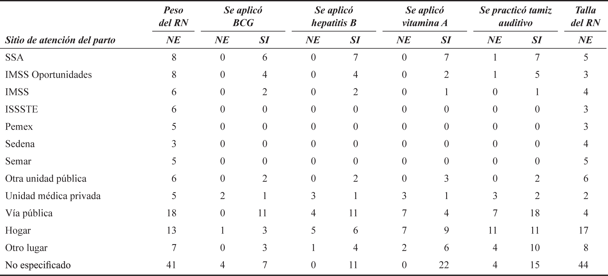 Por otro lado, el no registro de variables también se observa en el CN de partos que ocurrieron tanto en las instituciones de salud como fuera de ellas. En el Cuadro 3 se muestran los porcentajes de NE y SI de algunas variables seleccionadas por lugar de ocurrencia del nacimiento. Se puede reconocer, en primer lugar, que en los partos institucionales no se registran al 100% datos como el peso del RN, o no se especifica si se realizó la aplicación de vacunas o vitaminas; sobre todo en el IMSS Oportunidades y la SSA el desconocimiento o SI es de alrededor de 5% para cada una de las variables. En segundo lugar, se observa una elevada desinformación cuando no se ha especificado el sitio de atención del parto con los NE y SI de las variables. Esto apuntaría a que se tenía la intención de emitir un CN sin importar si el informante era el adecuado, pues valores elevados se esperarían con nacimientos en la vía pública, el hogar u otro sitio, como se observa en la información del Cuadro 3.