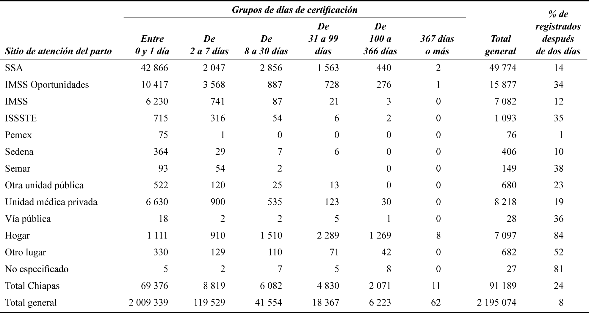 Sin embargo, en el Cuadro 4 se puede reconocer que la expedición del certificado después de dos días del nacimiento varía conforme al sitio de atención del parto. Petróleos Mexicanos (Pemex) tiene sólo el 1% de registrados después de dos días, en cambio en instituciones como el IMSS-Oportunidades, el Instituto de Seguridad y Servicios Sociales de los Trabajadores del Estado (ISSSTE) y la Secretaría de Marina Armada de México (Semar), dicha proporción es de alrededor de 35%. Consideración aparte requieren los casos acontecidos en la vía pública, cuyo porcentaje es similar al de las instituciones mencionadas (35%). Y los acontecidos en el hogar, donde casi la totalidad de CN se fecharon después de dos días, con un 84%. Una situación semejante existe para los acontecidos en otro lugar, con 52 por ciento.