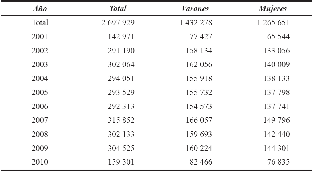 La población base considerada fue la censada en 2001, corregida por cobertura y conciliación censal al 30 de junio de 2001 por el INDEC (2005c: 8). A esta población se añadieron las EV, aquellas que se refieren a los nacimientos por sexo y a las defunciones por sexo intercensales (véase los Cuadros A1, A2 y A3 del Anexo). Estos datos fueron ajustados: se distribuyeron proporcionalmente (mitad a cada sexo) las defunciones y los nacimientos sin sexo especificado. No se han realizado ajustes por subregistro de defunciones o de nacimientos o de inscripción tardía, ya que se supone que las estadísticas vitales, durante el periodo intercensal, fueron de calidad satisfactoria (Bay y Orellana, 2007), y la cobertura fue completa tanto en el registro de nacimientos (Fernández y otros, 2008; OMS, 2012) como de defunciones (Ribotta, 2013).