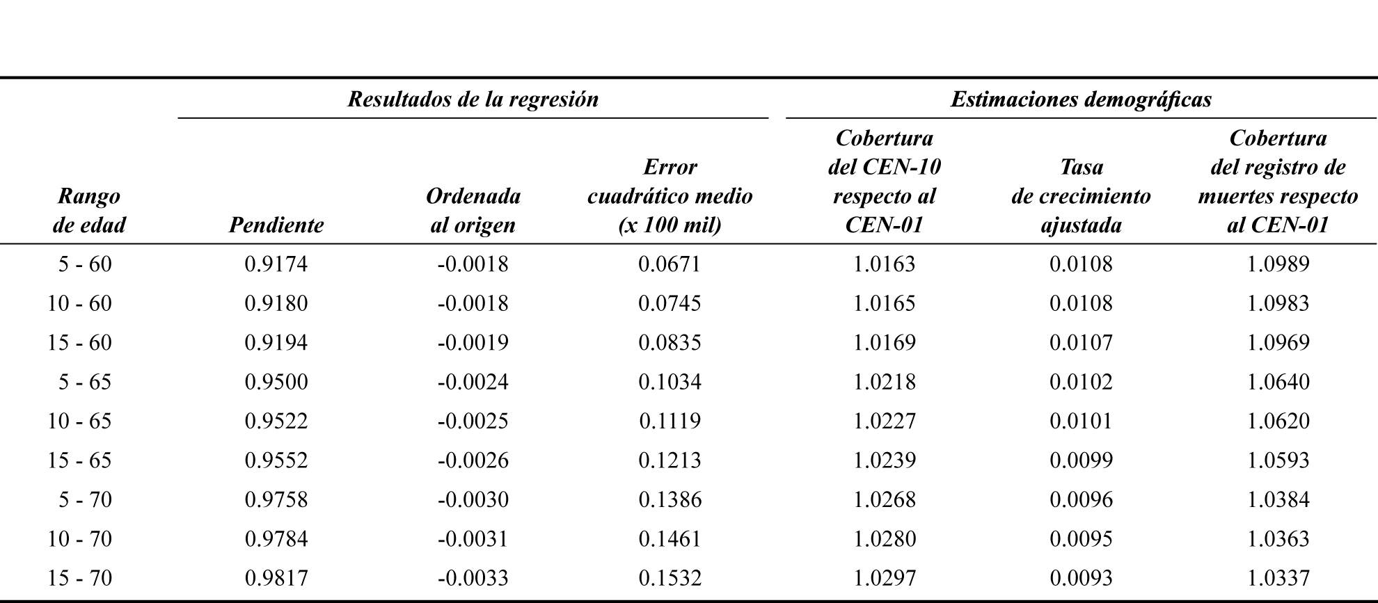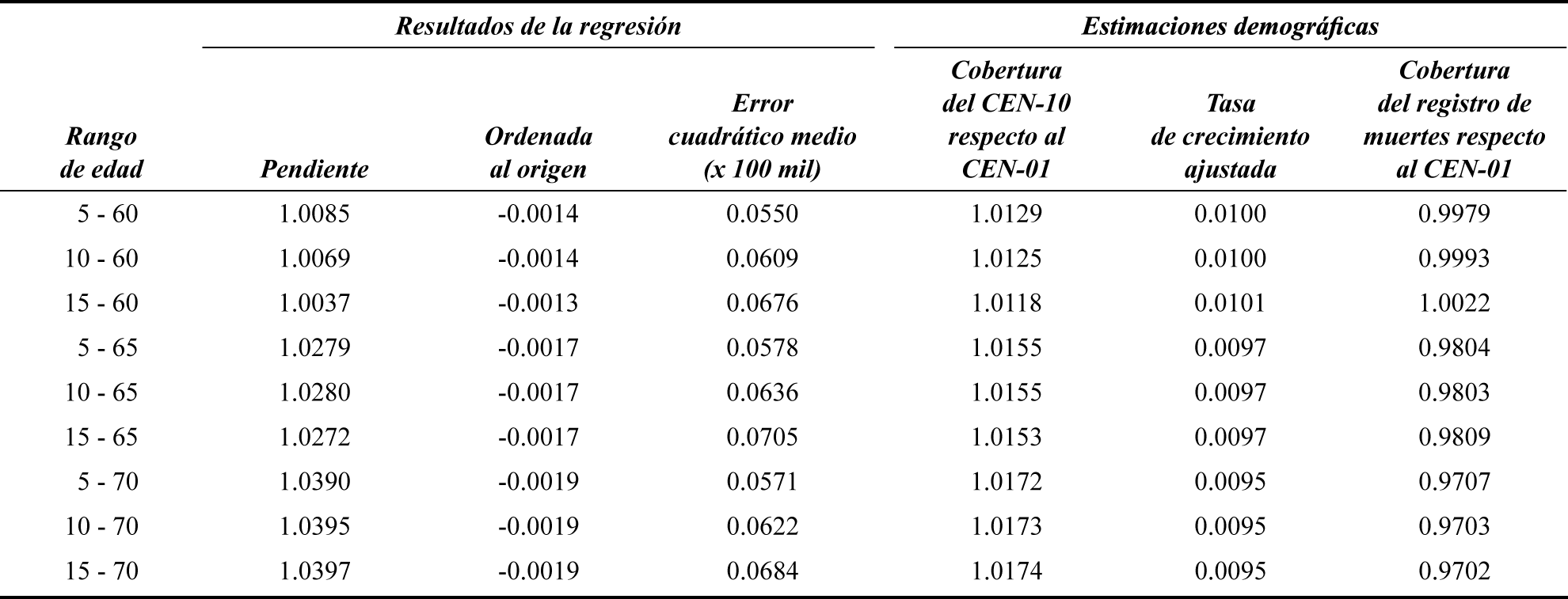 La primera aproximación propuesta es la de realizar un análisis al nivel de cobertura del CEN-10 basado en la comparación de los resultados definitivos con el crecimiento natural estimado para el periodo intercensal. Se pretende con ello elaborar una hipótesis sobre el grado de omisión del CEN-10 a través de la técnica basada en Celade (1968). El procedimiento se basa en la ecuación compensadora y se sustenta en los datos provenientes de los censos y en la información de las estadísticas vitales (EV)2 (Rincón, 1984: 11; Celade, 2014: 57-60). Este modelo adopta la forma siguiente: