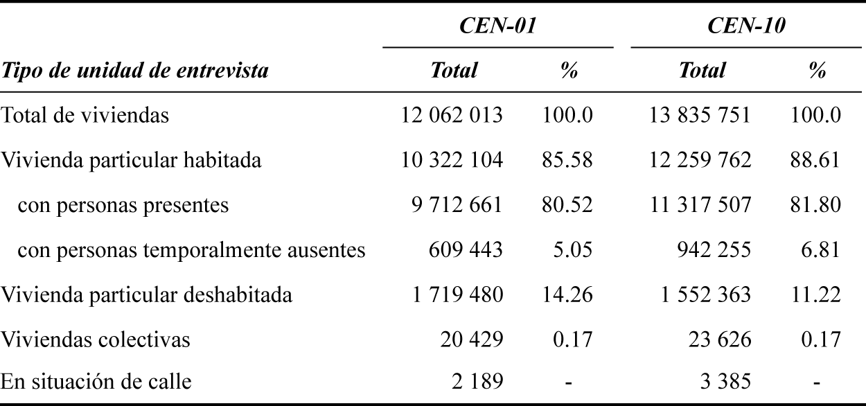 Como se muestra en el Cuadro 5, se advierten, en principio, valores coherentes tanto en los totales como en la distribución de las categorías de condición de ocupación de las viviendas (tipo de unidad de entrevista) y tipo de vivienda, al comparar el CEN-01 y el CEN-10. Se observa un crecimiento de las viviendas particulares habitadas (del 85.6% en el CEN-01 al 88.6% en el CEN-10) junto a un descenso de las viviendas particulares deshabitadas (del 14.3 al 11.2%). El resto de las categorías se mantiene estable. En las viviendas particulares habitadas quienes sostienen principalmente el crecimiento son las viviendas con personas temporalmente ausentes.