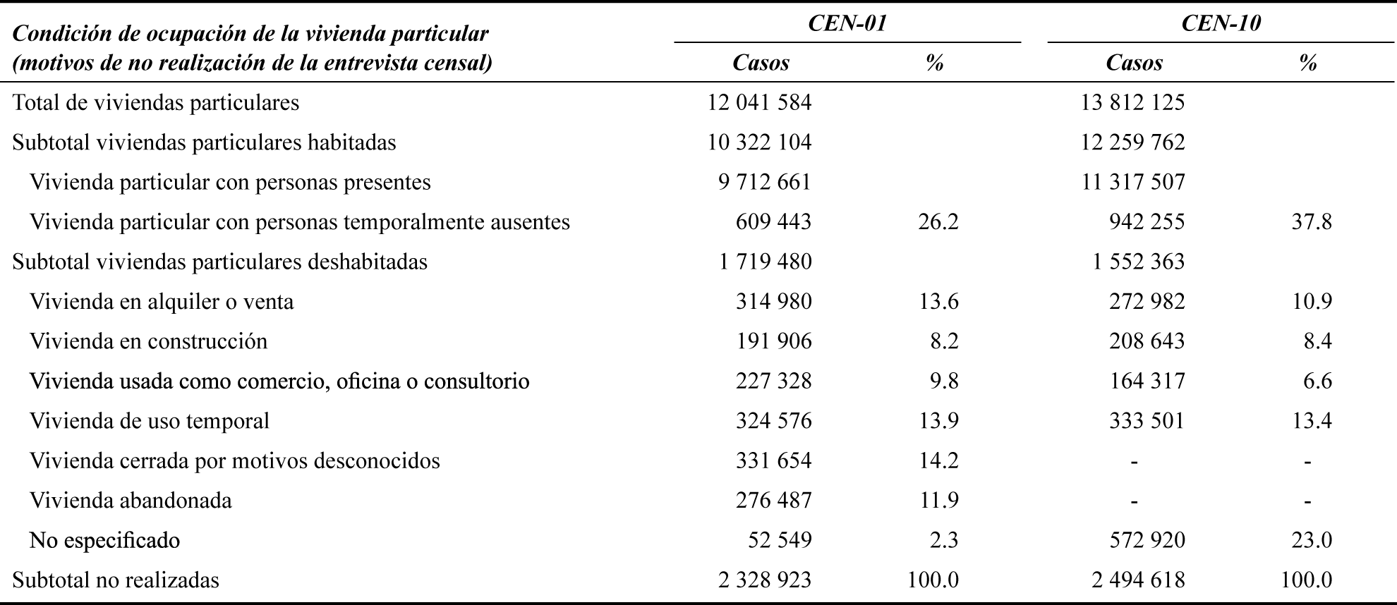 Si se desglosa el universo de viviendas particulares, la información relativa a su condición de ocupación muestra que el porcentaje de viviendas con personas temporalmente ausentes, dentro del total de los motivos de no realización de la entrevista, fue el 26.2% en el CEN-01 y el 37.8% en el CEN-10. Las viviendas en alquiler o venta redujeron su participación, pasando de 13.6% en el CEN-01 a 10.9% en el CEN-10. Aquellas en construcción y de uso temporal se encuentran en un nivel relativamente estable en ambos censos, mientras que las viviendas de uso comercial se reducen sensiblemente, pasando de 9.8 a 6.6% en 2010. Otras causas también pierden su participación, pasando de 28.4% en el CEN-01 a 23.0% en el CEN-10 (véase el Cuadro 6).