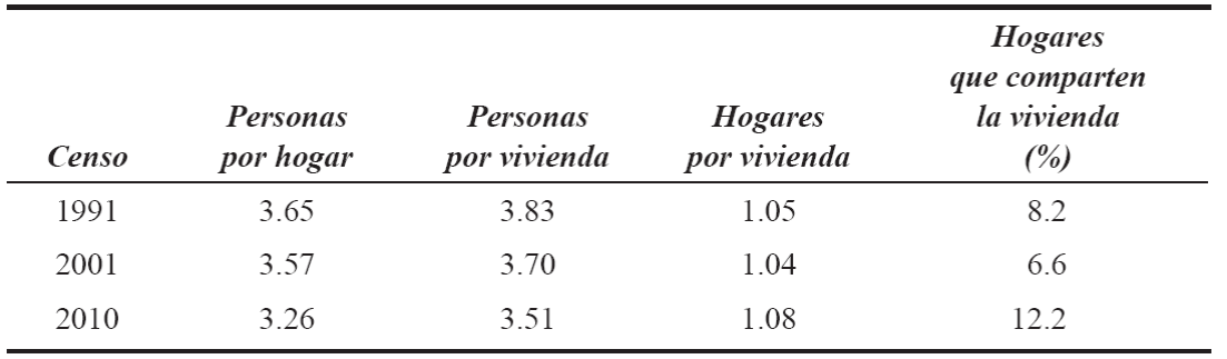 De acuerdo con el Cuadro 7, el número promedio de personas en viviendas particulares fue de 3.83 en el CEN-91, de 3.70 en el CEN-01 y 3.51 en el CEN-10 (con una tendencia similar a nivel hogar). Estos valores representan un descenso del 5.1% en la media de personas por vivienda en el último periodo intercensal, número que, a falta de otra información, no parecería indicar pérdida en la cobertura de personas dentro de las viviendas censadas (al mismo tiempo se observa un llamativo crecimiento en la cantidad promedio de hogares por vivienda y una mayor concentración de esos hogares -aumento en el porcentaje de hogares que comparten vivienda- en el último periodo intercensal).20