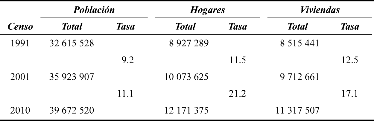 Independientemente del ejercicio del párrafo anterior (que entra en un aspecto meramente especulativo), y, aunque sea arriesgado, teniendo en cuenta los problemas de datos de viviendas de 2001, en tercer y último lugar pueden observarse las tasas de crecimiento de las viviendas en el último periodo intercensal (véase el Cuadro 8). La tasa anual media de crecimiento de las viviendas particulares es positiva en ambos periodos intercensales, mayor en el lapso 2001-2010 (17.1 por mil) que en el decenio 1991-2001 (12.5 por mil). Los valores positivos en las tasas de crecimiento de viviendas indican su aumento, dato coherente con un crecimiento demográfico y económico -predominante- entre censos. El mayor crecimiento relativo de las viviendas en el periodo intercensal con respecto a la población puede ser una posible indicación de la pérdida potencial de cobertura de población en viviendas con personas presentes del CEN-10, con respecto al CEN-01, o de problemas de clasificación de las viviendas por tipo de ocupación.