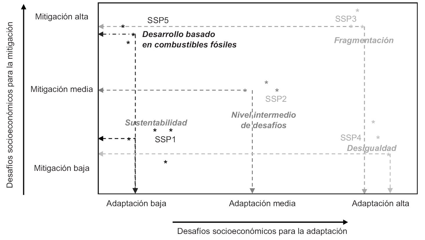 De acuerdo con la Figura 1, los escenarios que combinan niveles bajos de desafíos de mitigación y adaptación son los de la Trayectoria Socioeconómica Compartida 1 (SSP1), con la narrativa de “sustentabilidad” ya que asumen: bajo crecimiento de la población, alto crecimiento económico, altos niveles de educación, gobernabilidad, una sociedad globalizada, cooperación internacional, desarrollo tecnológico y conciencia ambiental. Contrario a la SSP1, los escenarios de la SSP3 se describen como de “fragmentación”. Éstos asumen crecimiento poblacional alto y desarrollo económico bajo, niveles de educación inferiores, y una sociedad regionalizada y con poca conciencia ambiental, por lo que representan un nivel alto de desafíos para la adaptación y la mitigación.