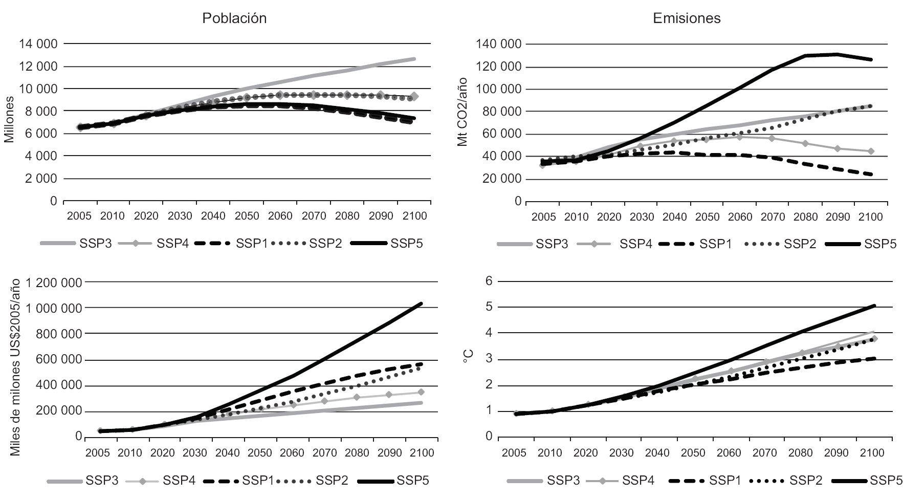Las Trayectorias Socioeconómicas Compartidas (Shared Socioconomic Pathways, SSP por sus siglas en inglés) describen futuros alternativos de desarrollo socioeconómico y representan, a partir de una narrativa y de variables cuantitativas, cómo podría evolucionar el mundo en las décadas siguientes y qué desafíos suponen esos cambios para la mitigación y la adaptación (Arnell et al., 2004; O’Neill et al., 2014; Ebi et al., 2014). Por ejemplo, proponen considerar la evolución de las economías, los niveles de desigualdad futuros, y el cambio demográfico y tecnológico, entre otros. Elementos que inciden sobre los niveles de emisiones de GEI y que, a la par, pueden afectar las alternativas para adaptarse a los impactos del cambio climático.