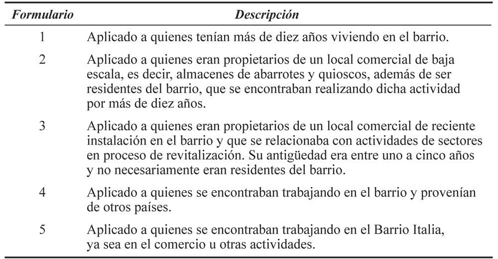 La oralidad, las narrativas y los relatos son lenguajes que hacen emerger no sólo conciencias temporales, sino también espaciales. Las primeras se agrupan en lo que ha sido denominado como el conjunto de los tropos de la metahistoria (White, 1992), cuya materialidad es capaz de ser leída en lo espacial, rezumando flujos simbólicos propios del metaespacio. Para rescatar estas ideologías urbanas, han sido elaborados cinco instrumentos de entrevista breve para la recuperación de experiencias que, desde la narrativa vivencial, posibilitan el acercamiento a las subjetividades de paseantes, propietarios y empleados en el Barrio Italia (Hernández et al., 2010). Estos instrumentos quedaron ordenados como se muestra en el Cuadro 1.