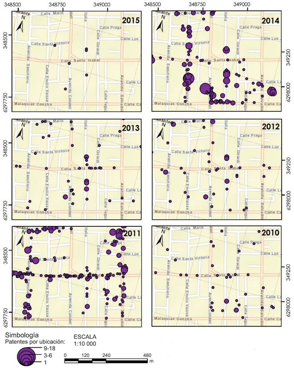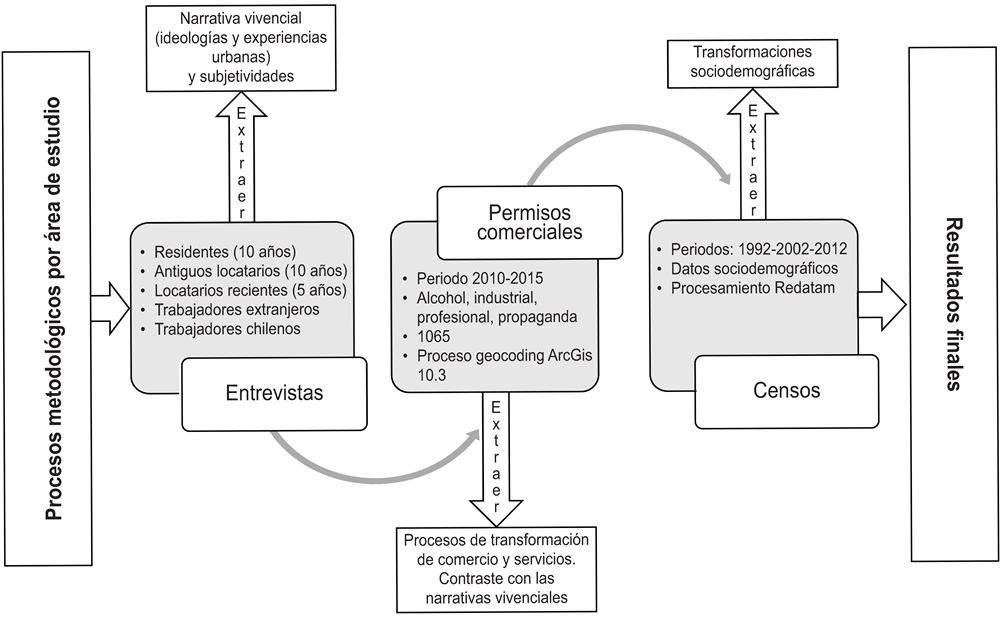 Para complementar esta información cualitativa se confeccionó una base de datos con los permisos de funcionamiento comercial6 otorgados entre 2010 y 2015 por la Municipalidad de Providencia, donde se ubica el Barrio Italia. Éstos se clasificaron en cinco categorías: alcohol, comercio, industrial, profesional y propaganda. Tales registros, que ascienden a 1 065, fueron procesados en ArcGIS 10.3, desde el módulo geocoding. Finalmente, para verificar la evolución sociodemográfica del Barrio Italia, se utilizaron los censos de población 1992, 2002 y 2012, con el software Redatam. La síntesis de estos procesos se aprecia en el Esquema 1.