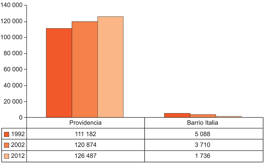 Sin embargo, dentro del Barrio Italia la presencia de alquileres con fines comerciales es masiva. Para diciembre de 2016 la oferta para estos productos alcanzaba las 15 unidades, promediando un costo de USD 1 875 por mes de uso. Por otro lado, las viviendas en venta, todas usadas, anotan un registro menor, identificándose sólo una unidad dentro del área, cuyo valor asciende a los USD 833 000.8 Esto explicaría la reducción de población residencial en favor del loteo masivo de unidades habitacionales con objeto de una densificada comercialización de éstos, arrojando incluso una sostenida disminución de la habitación residente respecto al total de la comuna en relación a los tres últimos censos, contabilizados desde 1990 en adelante. Esto aparece expresado en la Gráfica 1.