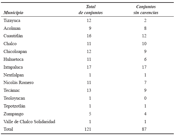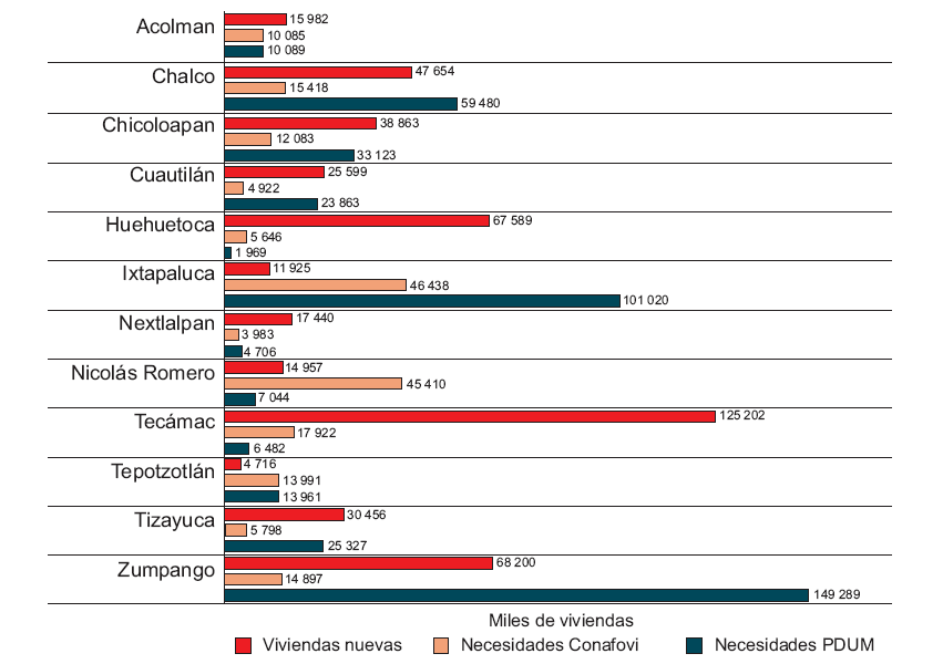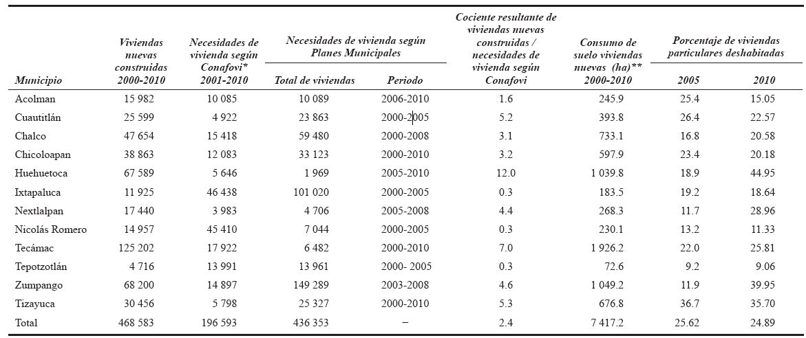 De acuerdo con la Comisión Nacional de Fomento a la Vivienda (Conafovi, 2004), en 12 de los 14 municipios de estudio11 se necesitaba construir un total de 196 593 nuevas viviendas en el periodo 2001-2010. No obstante, se construyeron 468 583 viviendas, incorporando aproximadamente 7 400 ha de suelo urbano. Ello significa que el número de viviendas ofertadas fue 2.4 veces mayor con respecto a la demanda federal proyectada.