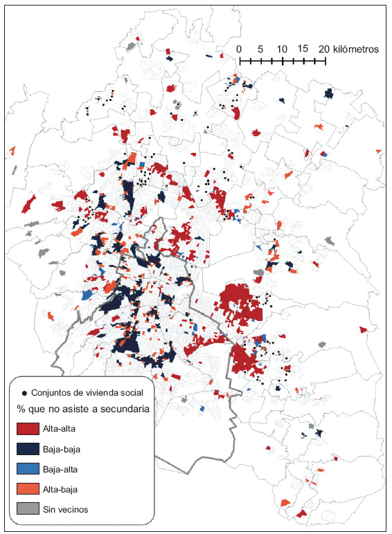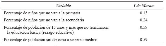 En el caso del porcentaje de niños que no asisten a la secundaria, se observan altos valores en las zonas periféricas de la ciudad. El rezago educativo, medido como porcentaje de la población de 15 años y más con educación básica incompleta, muestra un patrón típico de centro-periferia. Por otro lado, el porcentaje de población sin derecho a servicio médico público exhibe un patrón aún más acentuado a escala metropolitana. Respecto a la accesibilidad a la educación en sus dos niveles básicos, se aprecia que la asistencia a la educación primaria es casi universal. Los índices de Moran globales muestran la intensidad con la que se agrupan los atributos de interés en el espacio: a valores más altos, mayor concentración espacial (Cuadro 2).