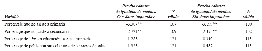 Adicionalmente, realizamos pruebas de análisis de la varianza para comparar el efecto del tiempo en las variables de educación y salud:9 porcentaje de niños que no asisten a la primaria, porcentaje de niños que no asisten a la secundaria, rezago educativo (porcentaje de personas mayores de 15 años sin educación básica completa) y porcentaje de población sin derecho a servicios de salud pública. En la segunda columna (Cuadro 3) se incluyen todos los conjuntos con datos imputados y en la tercera se reportan únicamente los resultados de los conjuntos en la cartografía digital.