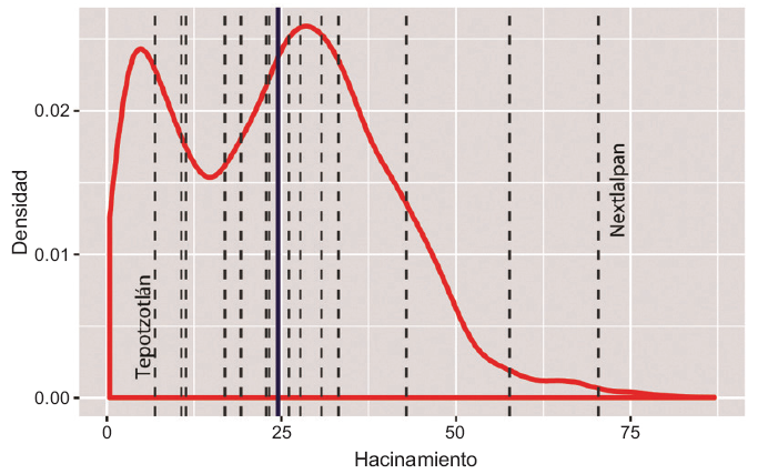 En el siguiente gráfico se muestra la distribución del porcentaje de viviendas con algún grado de hacinamiento de la ZMVM: en rojo se muestra el valor promedio metropolitano y en líneas punteadas los valores promedio municipales en las AGEB de los conjuntos analizados (Figura 10). La mitad de los municipios muestran valores por arriba del promedio metropolitano (25%), siendo el peor caso Nextlalpan con casi 70% de sus viviendas con algún grado de hacinamiento. En el otro extremo se localiza Tepotzotlán, con apenas un valor promedio de 6.9 por ciento.