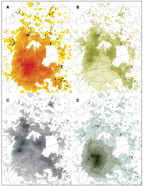 En términos de segregación espacial, resaltamos de este análisis la existencia de una estructura claramente diferenciada con relación a la distribución de la accesibilidad al empleo por sector (Figura 2). Por un lado, tanto el comercio al por menor -que representa 33% de los trabajos de la ZMVM- como la industria manufacturera -la cual aglutina 9.8% de los empleos totales-, tienden a concentrarse en los bordes metropolitanos (en contraste con los empleos vinculados al sector servicios, que muestran un fuerte patrón de concentración en la zona central de la ciudad). Lo anterior pareciera matizar ligeramente la señalada “desconexión” de los nuevos conjuntos de vivienda social periurbanos en términos de acceso al empleo. Si bien son los empleos peor remunerados, su concentración espacial periférica permitiría deducir cierto acceso desde los nuevos conjuntos de vivienda social.