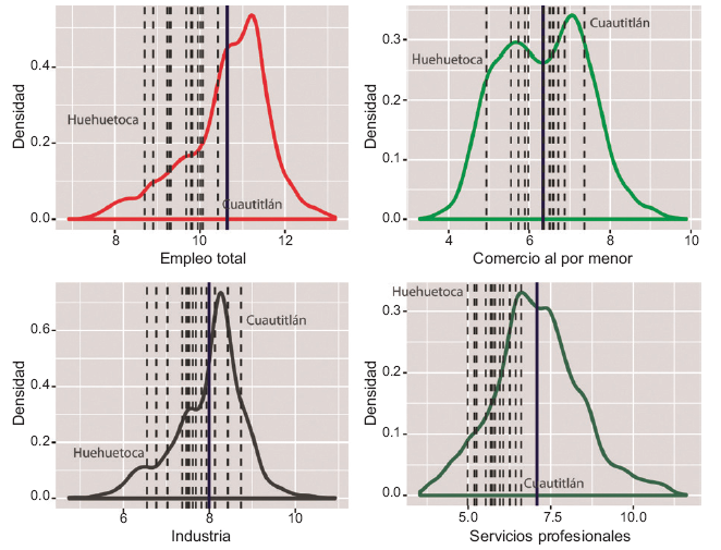 Empero, al comparar a detalle la posición de los 121 conjuntos habitacionales, se hace evidente la baja accesibilidad de éstos al empleo. Para ello promediamos el valor de accesibilidad del AGEB más cercana por municipio a cada conjunto habitacional. En la Figura 3 se muestran los gráficos de la distribución del índice de accesibilidad en escala metropolitana transformada logarítmicamente. Las líneas punteadas corresponden al promedio de los conjuntos por municipio y la línea azul al valor promedio metropolitano. El primer elemento interesante es que los conjuntos asentados en Huehuetoca -uno de los municipios más periféricos de la ZMVM y que registra una de las tasas más altas de vivienda deshabitada- son los que presentan los valores más bajos de accesibilidad. El segundo elemento relevante es que para el empleo total, todos los municipios que albergan los nuevos conjuntos habitacionales se localizan por debajo del valor promedio de accesibilidad metropolitano.