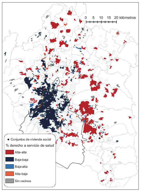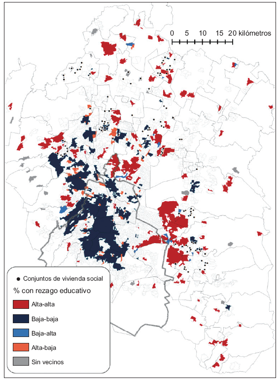 Los mapas LISA (Local Indicators of Spatial Association), también conocidos como conglomerados espaciales, muestran las regiones de autocorrelación espacial positiva y negativa. Ello permite conocer si una variable se distribuye o no aleatoriamente en el espacio. Existe autocorrelación positiva cuando los valores altos o bajos tienden a agrupase en el espacio, y autocorrelación negativa cuando los valores de la variable de interés están rodeados de vecinos con valores disímiles. A escala metropolitana se aprecia cómo las zonas de más alta segregación se localizan en los municipios periféricos (autocorrelación positiva), siendo los conglomerados de rezago educativo y carencia de derecho a servicios de salud pública particularmente amplios (Figuras 4, 5, 6 y 7).