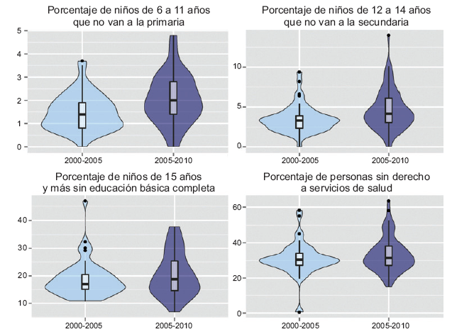 Para la no asistencia a la secundaria, el promedio de los conjuntos más antiguos es menor que el de los más recientes (3.4% vs. 4.4%). En este caso, es más evidente la diferencia en la dispersión entre los dos periodos. Para los conjuntos con datos imputados, la diferencia en el rezago educativo entre los dos periodos es de 1.1%, mientras que el porcentaje de personas sin derecho a servicios de salud en los conjuntos del primer periodo es de 30.4%, y para el segundo periodo aumentó a 32.7 por ciento.