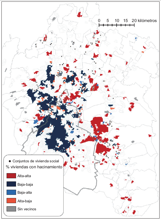El análisis muestra un claro patrón de concentración de AGEB con altos porcentajes de hacinamiento (I de Moran de 0.64) en la periferia de la ZMVM. De los 121 conjuntos de vivienda social estudiados, la mayoría de ellos se encuentran en AGEB con autocorrelación positiva alta (Figura 9), es decir, con concentración espacial de valores altos de hacinamiento.